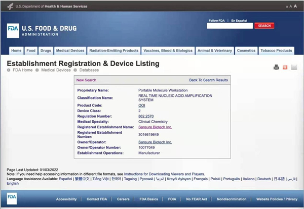 美国食品药品监督管理局(FDA)是国际医疗审核权威机构,通过FDA认证的食品、药品、化妆品和医疗器械等产品,是全球权威标准证明。好博体育生物四通道iPonatic核酸检测分析仪获美国FDA认证后,将有效扩大和满足全球市场各级检测防控需求,为全球疫情防控工作持续助力,推动公司全球化事业发展。